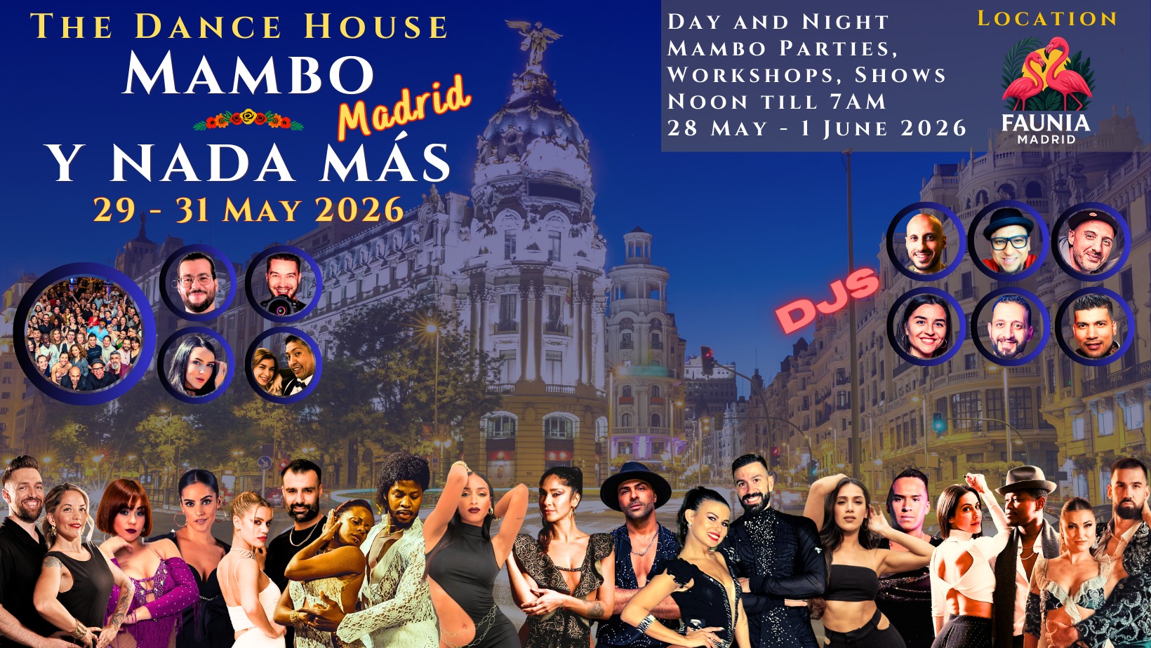 After a one year break, we come back to Madrid, the cultural meeting point between the old and the new worlds. A 100% Mambo event in Spain is our message to the world that our beloved dance is alive and thriving. We are changing the location, and for the first time, we will be dancing at the gorgeous Faunia. Join us for a one of a kind experience!